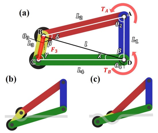The fixed mechanism is depicted in Figure 6b. It consists of four links: , , , and . is connected to the guide pulley that fixes the rope and caterpillar track. It guides the driving path. The power provided by the motor is input to . rotates with the movement of and is connected to a rubber pulley to generate tension by winding the rope in an S shape. connects and . That is, is a fixed bar, is a crank, is a coupler, and is a follower.