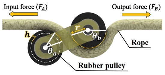 The specific structure and movement of the fixed mechanism are depicted in Figure 7. Figure 7a displays the first position of the fixed mechanism. The rope goes between the two rubber pulleys at . Figure 7b,c show the position variations of the fixed mechanism when moves by the power supplied from the motor. When rotates CCW, also does so, as depicted in Figure 7b. The rope is wound in an S shape around the rubber pulleys attached to both ends of [21]. This is illustrated in detail in Figure 8. If the area where the rope is in contact with the rubber pulley is A, the angle by which the rope is wound around the rubber pulley is (, the angle unit is radian), the radius of the rubber pulley is r, and the depth of the U-shaped groove of the rubber pulley is h, then