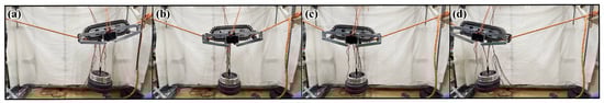 Figure 10a displays a test bench designed to evaluate the performance of the fixed mechanism. The RMA was placed on top of the test bench and operated the fixed mechanism on both sides to wind the rope and generate tension. Figure 10b is an enlarged view of the rubber pulley part of the RMA. As explained in Equation (6), the tension in the rope varied depending on the winding angle. A weight was hung from one side of the ropes. It was tested whether the fixed mechanism could hold the rope so that it did not slip. As depicted in Figure 10c, the rope with the weight was connected to a wire encoder. Therefore, when a slip occurred in the rubber pulley, the rope moved down and the wire encoder detected this. The load of 392.4 N corresponds to the gravitational force generated by a 40 kg payload, which is the expected weight each RMA should support in practical use. In the experiment, a slip did not occur with a load of 495.24 N. This verified that the fixed mechanism has a sufficient rope fixation capability.