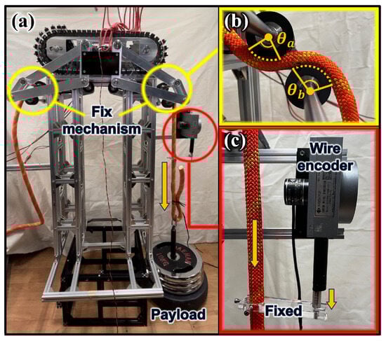 A test bench to evaluate whether a slip occurs in the rubber pulley with payload for verifying the performance of the fixed mechanism. (a) The overall configuration of the test bench. (b) The operation of the fixed mechanism. (c) The wire encoder connected to the rope.