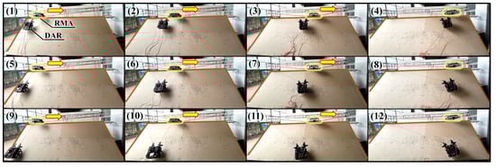 The experimental results are shown in Figure 12. Figure 12a shows the value of the current utilized by the left and right motors of the DAR at each test point when the RMA was not used. Figure 12b shows the value of the current utilized by the left and right motors of the DAR at each test point when the RMA was used. This is the result of Figure 11. The green bar graph represents the current consumption of the left motor of the DAR, the orange bar graph represents the current consumption of the right motor of the DAR, and the red curved graph represents the average of the two current consumption values. Comparing the results, overall, all the test points consumed less current with the RMA than without it. In particular, the difference in current consumption depending on whether the RMA was used or not was the largest in the test point depicted in Figure 12(2)–(4), and is in the section indicated by the yellow area. This is because and were reduced, as explained in Figure 2 in Section 2. If the RDWR is also applied, the current difference would be larger because the load on the RMA would be larger. This implies that dead zones that may occur depending on motor specification can be reduced using an RMA.