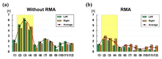Graph showing experimental results obtained with and without RMA use. The x-axis corresponds to the test points in Figure 11. The y-axis represents the current consumption of the motors on both sides of the DAR at each test point. (a) Graph showing the results obtained when RMA is not used. (b) Graph showing the results obtained when RMA is used.