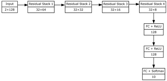 By maintaining identity mappings across layers, DRNs preserve signal integrity and ensure the visibility of key features even in deeper network stacks, an essential property for distinguishing between subtle modulation schemes. Our implementation specifically utilizes four optimized residual stacks, a simplified yet effective configuration that achieved superior classification performance in our experiments. The complete network architecture is summarized in Table 1 and Figure 2.