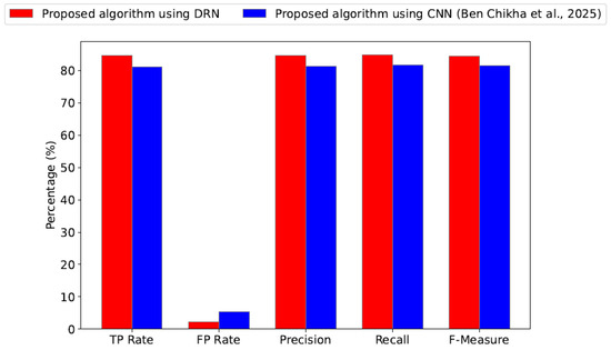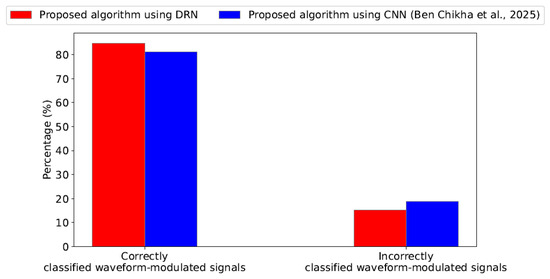 Figure 5 presents the average performance metrics (TP, FP, precision, recall and F-measure) in percentage across all waveform-modulated signals in , evaluated under identical system parameters and a fixed . The results compare the DRN-based method with the CNN-based benchmark algorithm from [17]. The proposed DRN approach demonstrates consistently superior performance in terms of recall, TP rate, F-measure, and precision. In addition, it achieves a smaller false positive rate compared to the benchmark method. These findings clearly indicate that the DRN-based AMC algorithm offers more accurate and reliable modulation classification, making it a more effective choice than the random committee-based technique used in [22].