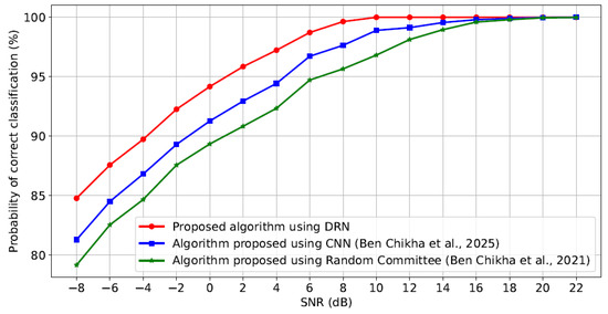 Figure 7 presents the probability of correct classification of waveform-modulated signals in versus SNR for our proposal deploying the DRN technique. This performance is compared against two benchmark algorithms: the CNN-based method introduced in [22] and the Random Committee classifier proposed in [17], which is known to outperform several traditional machine learning techniques. All experiments are conducted under identical system settings to ensure a fair comparison.
