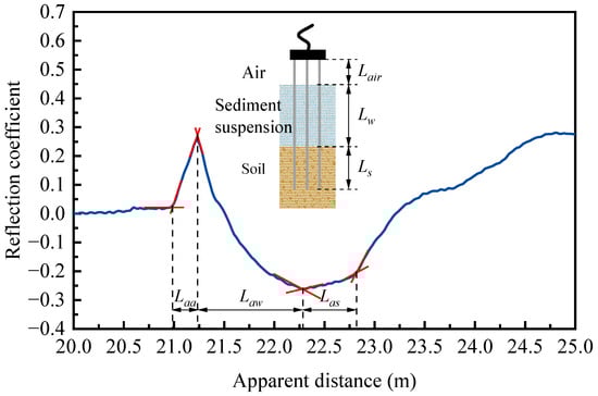 During the test, the electromagnetic signal travels through air, sediment suspension, and saturated soils sequentially and reflects at four points (i.e., coaxial cable–probe, air–suspension, and suspension–soil interfaces and the probe end), as is shown in Figure 1. Along with this segmentation, the positions of water level and soil bed can be determined, enabling an integrated measurement of water depth and scouring distance from a single reflected waveform. The distribution lengths of each medium are calculated based on Equation (6).