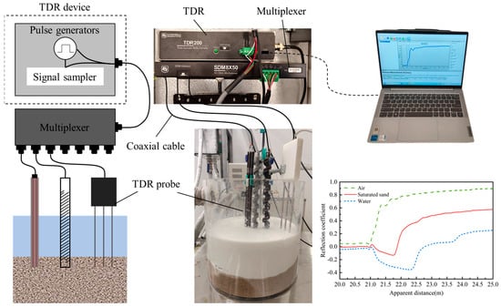 The experimental system consists of a time domain reflectometer and a transmission line with sensing probes. The TDR equipment typically includes a pulse signal generator and an electromagnetic wave signal sampler, while the transmission line system consists of coaxial cables that transmit electromagnetic waves and waveguide probes placed in the medium for testing. A single TDR equipment can be connected to multiple probes simultaneously through a multiplexer, as shown in Figure 2. The TDR device generates an electromagnetic pulse that propagates through the transmission line system, and captures reflection signal data. This reflected signal is related to the material properties and impedance characteristics around the probe. The typical experimental setup is composed of a TDR miniaturized unit (TDR200, Campbell Scientific, Logan, UT, USA), processing control software PC-TDR v3.0, coaxial cables, different types of probes, and a multiplexer (SDM8X50; Campbell Scientific), working like closed-circuit radar and detecting any mismatch along the measuring lines. During the testing, pulse signals are generated from TDR and transmitted into different coaxial cables in sequence to allow multi-probe monitoring within a few seconds. The excited TDR signal is a step electromagnetic impulse, which is characterized by a rise time of 200 ps, corresponding to a frequency bandwidth of around 2.75 GHz.