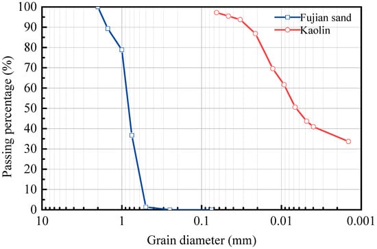 Particle size distribution of Fujian sand and kaolinite clay.