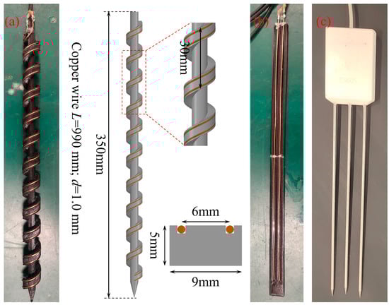 It should be mentioned that the probe design parameters were determined based on comprehensive considerations of measuring accuracy, ease of installation, and fabrication. Although increasing the space between the helical blades will improve probe’s drivability into hard soils, it reduces measuring accuracy as a result of affecting the total wire length. The distance between two wires was determined based on the electric properties of the testing media and needs to be adjusted for future larger probes used in field conditions. A dual-wire configuration was adopted with two bare copper wires wound in parallel. Each wire is 960 mm long and 1.0 mm in diameter. The diameter of the rod was designed to balance structural strength for installation and the minimization of skin effect for soil disturbance. The spiral probe was compared with two other types of probes, i.e., a conventional dual-rod probe with the same wire configurations and a commercial three-rod probe, as is shown in Figure 4.