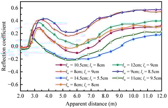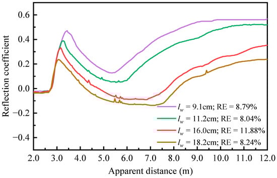 The TDR system was further evaluated by conducting experiments under varying testing conditions, including changing water depths, bed elevations, and suspended sediment concentrations. The environmental temperature affects the dielectric constants of the soil–water system and, in return, determines the measuring accuracy of the TDR system. To validate the proposed temperature correction algorithm, TDR experiments were conducted on varying temperature conditions using three types of probes. The baseline temperature was set at 20 °C, and the water temperature was gradually increased to 24.1 °C and 35.3 °C through a water bath unit. The sensing probes were connected to the TDR device via the SDM8X50 interface. Figure 6 presents the TDR reflection waveforms recorded by the spiral probe under different water depths lw and sand bed elevations ls under 20 °C temperature.