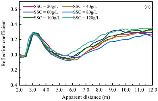 Three phases exist in a typical fluvial soil–water system, including saturated bed materials, water with suspended sediment, and free air. A sediment suspension is mainly composed of water and solid particles. The apparent dielectric constant of soil particles Ks is temperature-insensitive with a narrow range from 3 to 9, depending on their mineral composition []. On the contrary, the dielectric constant of water Kw is around 80 and temperature-dependent, as indicated in empirical Equation (4) []. As a result, the temperature is a critical parameter for calculating the water dielectric constant. In the experiments, water temperature was obtained using temperature sensors installed near the water surface, with a measurement accuracy of ±0.2 °C. The dielectric constant of air is around 1. Differences in dielectric constant among different phases provide opportunities to detect interfaces among the system with a single reflective signal.