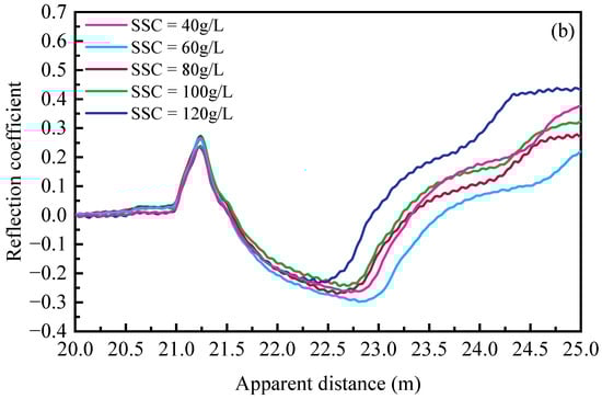 Figure 7 plots the measured reflected waveforms under different suspended sediment concentrations using the customized spiral probe and commercial three-rod probe at 20 °C. It clearly indicates that, as the water surface and sand bed elevation remain unchanged, the increasing SSC only affects the reflection segment corresponding to the water–air interface. With the increase in SSC in the fluid phase, the dielectric constant of suspensions decreases due to the existence of kaolinite particles, leading to a significant reduction in the apparent length of fluid segment in the reflected signal. Changes in the apparent length could be used to quantify sediment concentrations using the mixture model with a decent accuracy.