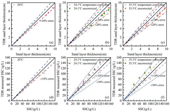 Temperature-related correction for TDR post-analysis on measuring sand bed thickness and suspended sediment concentration: (a) sand bed thickness at 20 °C; (b) sand bed thickness at 24.1 °C; (c) sand bed thickness at 35.3 °C; (d) SSC at 20 °C; (e) SSC at 24.1 °C; and (f) SSC at 35.3 °C.