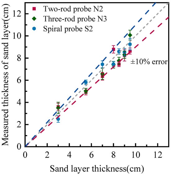 It can be seen from Figure 9 that the measuring errors of three types of probes are within ±10%, except for 3.0 cm cases. As the sand layer thickness increases, the error percentage decreases across all the probes. When the embedded length is insufficient, it is difficult to clearly identify reflecting points at the end of probes, which undermines the monitoring consistency. Furthermore, the spiral probe exhibits the most significant improvement in accuracy compared to the other two probes. The mean average relative error (MARE), which is equal to the ratio of absolute difference between TDR measurement and true value over true value, has been calculated for performance evaluations. The calculated MAREs are 11.3% for the N2 probe, 9.1% for the N3 probe, and 6.9% for the S2 probe. The spiral probe outperforms the N2 and N3 probes as it processes a much longer sensing length. The three-rod probe achieves better resolution than the two-rod probe, as it is structurally close to a coaxial cable and exhibits stronger anti-interference capabilities in signal transmission.