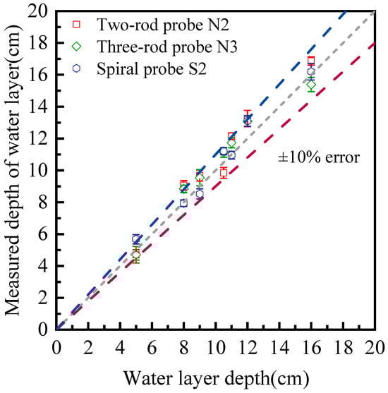 The results for water depth detection using three different types of probes are presented in Figure 10. A high consistency exists between TDR measurements and true values, and the measuring accuracy for all the probes lies within ±10%. Further analysis of measurement errors shows that the MARE is 8.6% for the N2 probe, 7.4% for the N3 probe, and 6.0% for the S2 spiral probe at room temperature. It is clearly shown the customized spiral probe outperforms the three-rod and two-rod probes in water depth measurement. It is also demonstrates that the TDR system is able to continuously monitor water level fluctuations with a high reliability.