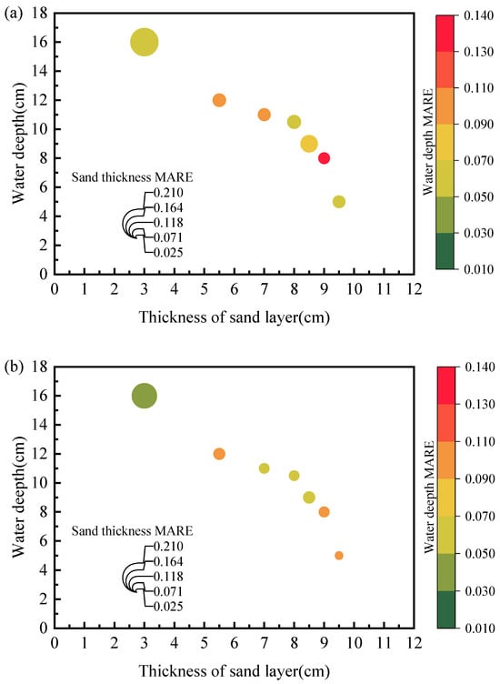 Figure 11 further compares the MARE between TDR measurements and true values with three different probe configurations. The size of data spheres represents the average relative error in the measured thickness of the sandy soil layer, i.e., larger diameters indicate greater average relative errors. The measurements were acquired by assigning different combinations of water depth and sand bed elevation. The embedding sand layer thickness ranges from 3.0 cm to 9.5 cm, while the water depth varies between 5.0 cm to 16.0 cm. It should be noted the analysis is based on lab-scale tests using our customized probes, and field implementations require a redesign of longer probes, which would increase the detection accuracy. The associated signal attenuation could be compensated by proper adjusting of wire spacing and coating materials. It has been shown that, by proper selections of coating materials and coating thickness, the signal attenuation could be better addressed. Compared to the two-rod probe (Figure 11a) and three-rod probe (Figure 11b), the spiral probe showed a significant improvement in MARE as the embedding sand layer thickness decreased (see Figure 11c). For measurements over different water depths, the two-rod probe exhibited more pronounced errors than the other two types of probes.
