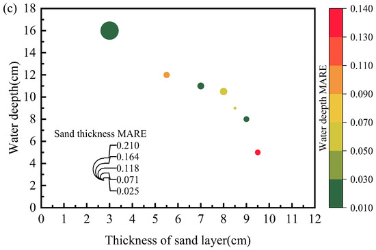 Comparison of MAREs over different water levels and embedding sand bed thicknesses using: (a) N2 probe; (b) N3 probe; (c) S2 probe.