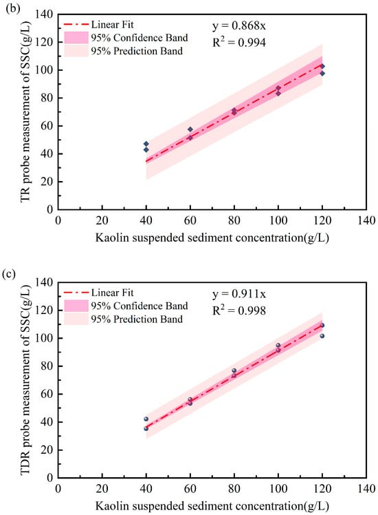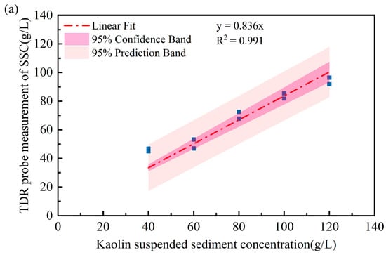 A linear regression is also provided between TDR measurements and true SSC values. There is a strong correlation existing for all the TDR probes. In particular, the SSCs measured with the spiral probe showed the lowest errors compared to the two-rod and three-rod probes. The concentrations measured by the three probes were lower than the prepared kaolin suspension concentration, primarily due to particle sedimentation and stratification in high-concentration kaolin suspensions. Even with rotational stirring to ensure uniform particle distribution, sedimentation and stratification remained unavoidable. Both the two-rod and spiral-shaped probes feature structural supports that stabilize the metal rods but reduce the contact area between the rods and suspended particles, thereby affecting concentration measurements.