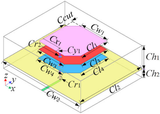 Three-layered structure of patch antenna (one driven patch and two stacked patches with truncated corners) used to ahieve UWB. Technique of truncated corners is used to induce CP [45].