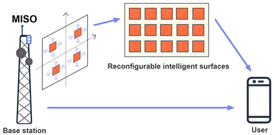 where denotes the channel between the RIS and the user, represents the channel between the BS and the RIS, and denotes the direct channel between the BS and the user. The vector is the precoding vector, s is the transmitted symbol, and n is the additive noise, modeled as a circularly symmetric complex Gaussian (CSCG) random variable with distribution .