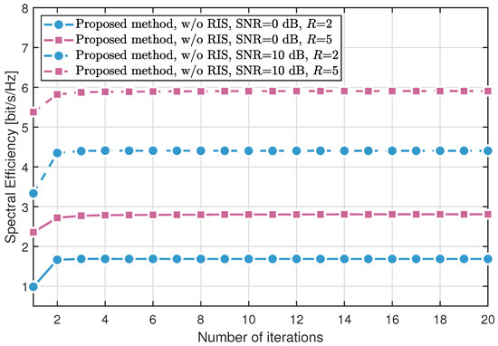 Figure 2 and Figure 3 compare the convergence behavior of the proposed method in two configurations: without RIS assistance and with RIS assistance, respectively. The simulations are conducted under multipath components, signal-to-noise ratios (SNRs) of 0 dB and 10 dB, and movable region sizes meters. The results show that the spectral efficiency increases with the number of iterations and converges within just three iterations, demonstrating the rapid convergence of the algorithm. Moreover, spectral efficiency is significantly influenced by both the SNR and the size of the movable region.