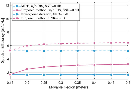 Spectral efficiency of different methods varying with the movable size (SNR = 0 dB).