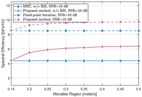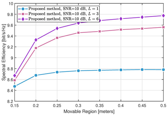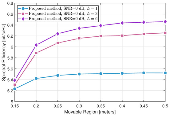 Figure 4 and Figure 5 demonstrate the impact of the movable region size on the spectral efficiency across different methods. Three key observations can be made: