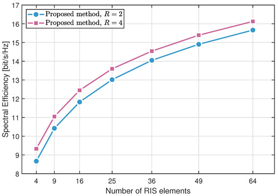In Figure 8, we evaluate the impact of the number of RIS elements on the performance. As the number of RIS elements increases, the system performance improves in a nonlinear manner.