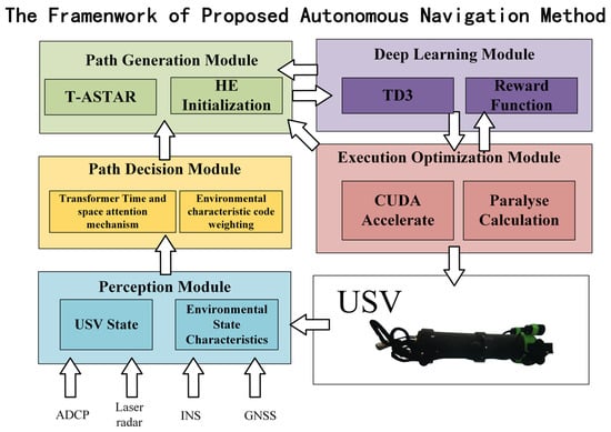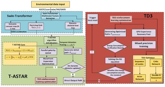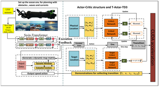 This holistic approach hierarchically integrates perception (Swin-Transformer), planning (T-ASTAR), control (TD3), and computation (CUDA), significantly advancing autonomy in dynamic ocean engineering scenarios. A summary of the structure diagram is shown in Figure 1.