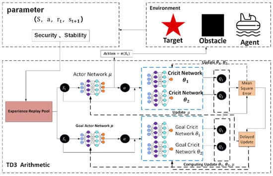 TD3 uses double Q network structures to solve the problem of policy estimation bias; adds delay updates between policies and actions, making the value function estimate stability among different periods and improving the characteristics of algorithm stability, adding noise into estimated rewards so as to make agents robust against noisy policies; and proposes a combined actor update strategy that could be regarded as a further improvement in a continuous control task situations compared to than DDPG that is more efficient and stable. Hence, it has become one of the dominant deterministic-policy-gradient algorithms. Based on its deep double-Q learning, the TD3 algorithm was proposed by Fujimoto et al. [19]. Luo combined priority experience re-play (PER) experiences and average updating Q-value strategies [20], which construct an I-TD3 algorithm (combined PER learning mechanism + average updating (Q1/Q2)) that not only can obtain a greater advantage when replayed using the sample prioritizing method but also achieves effective updating according to the average Q1/Q2 value and reduced Q value overestimate/underestimate (the value updating TD), thereby enhancing stabilization, like combining flexible structure features and special mission-related knowledge at the same time, and is therefore used to solve the path planning issue. Xu introduced the HTD3 algorithm, which addresses multi-objective path planning by breaking it down into single-objective sub-tasks. This approach utilizes a double-Q network structure and a delayed update strategy from TD3 for optimization. Key improvements include enhanced empirical sampling efficiency, adaptive network structure enhancement, and optimized interaction strategies between the agent and environment. By combining structural flexibility with mission-specific knowledge, TD3 emerges as a crucial tool for complex path planning challenges. Its core principle—“Double-Q network suppresses overestimation bias, and strategy delay enhances stability”—provides robust theoretical support for related research [21].