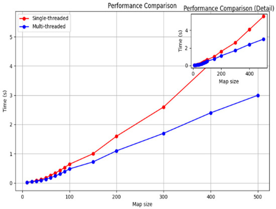 Concurrently calculating (Table 6), T-ASTAR will inevitably have to depend on GPUs in order to achieve real-time path planning performance in large-size areas. And CUDA also accelerates the search running time of T-ASTAR, but the spare computers await introducing much more powerful sense and decide models in advance. Transferring the burden from CPUs to GPUs has decreased the computer resources-consumption priority queue updating work, expanding nodes in parallel assessment, thus leaving room under its algorithm’s operation so that it can still obtain a comparatively adequate response speed for high-map resolution-rate regions.
