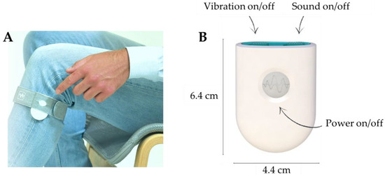 To address the limitations of existing smart cueing systems, a novel single-sensor smart cueing device, the Cue2walk (Cue2Walk International B.V., The Hague, The Netherlands), has been developed and is designed to be worn on the lateral side of the shank just below the knee (Figure 1). This device provides auditory and/or vibratory cues, at preference of the wearer. Cueing can be activated manually, via a button press or a hands-free motion (i.e., heel tap), or automatically by the real-time detection of an episode of FoG. Because gait kinematics during an episode of FoG are different than during normal walking, FoG can be detected in acceleration data. The Cue2walk device contains tri-axial accelerometers to collect this data, which is then processed by a combination of up to six algorithms with a sample frequency of 32 Hz for the detection of FoG episodes. In a previous study, we found that the Cue2walk device showed good performance to detect FoG, with a sensitivity of 89%, a specificity of 93%, and a latency of 1.6 s [19]. By integrating real-time detection with adequate external cueing in a single-sensor device, the device aims to enhance usability and accessibility in the everyday environment. However, empirical evidence regarding its usability and effectiveness in alleviating FoG remains limited. Therefore, this pilot study aimed to systematically investigate the user experiences and device usage of the Cue2walk smart cueing device in people with PD experiencing FoG, and its impact on perceived health-related QoL, FoG, and daily activities.