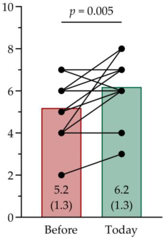 The respondents rated their overall health-related QoL a 5.2 (SD 1.3) before using the Cue2walk device and a 6.2 (SD 1.3) at the moment of filling out the survey on a 0–10 VAS (Figure 2). This improvement was significant (p = 0.005) with a large effect size (Cohen’s d = 0.83, 95% CI [0.45, 1.48]) [20], and, moreover, a change from an insufficient rating for overall health-related QoL to a sufficient rating. One respondent reported a decreased rating for overall health-related QoL at the moment of filling out the survey compared to before using the Cue2walk device, from a 7 to a 6 on a 0–10 VAS.