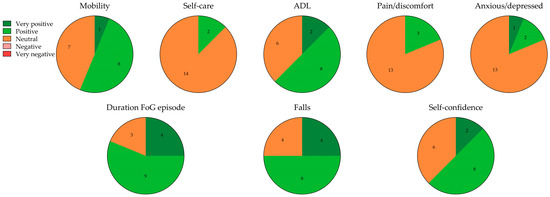 The respondents experienced predominantly positive effects on various domains of the modified EQ-5D-5L and the three additional FoG-related questions since using the Cue2walk device (Figure 3). The most positive responses were given for mobility (6.25% very positive, 50% positive), activities of daily living (ADL; 12.5% very positive, 50% positive), duration of an episode of FoG (25% very positive, 56.25% positive), number of falls (25% very positive, 50% positive), and self-confidence (12.5% very positive, 50% positive). Positive effects were also reported on the domains of self-care, pain/discomfort, and anxiety/depression, but to a lesser extent than on the other domains. A total of 15 of the 16 respondents reported at least one positive effect, while 14 of the 16 respondents reported at least two positive effects. Importantly, no negative effects were reported on any of the domains.