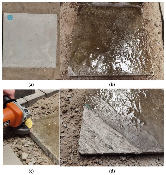 Recognizing that slab corners are the most vulnerable regions to void-induced damage, this study focuses specifically on void scenarios located at slab corners. To simulate these conditions, a handheld angle grinder was used to locally abrade the surface of the base layer, thereby intentionally disrupting the bond between layers and generating artificial voids as shown in Figure 1c,d. The abrasion depth was controlled at 1 mm to represent the shallow delamination commonly observed beneath slab corners in field conditions.