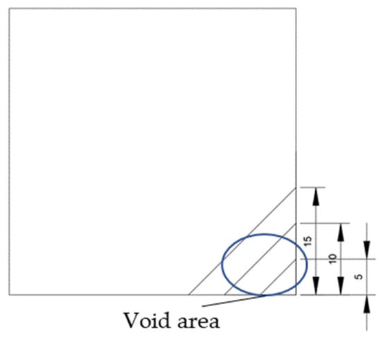 The void was shaped as an equilateral triangle to provide a simplified representation of localized interlayer separation. Four void sizes were considered: 0 cm (no void), 5 cm, 10 cm, and 15 cm, corresponding to increasing degrees of void development. The detailed configuration of each void case is shown in Figure 2.