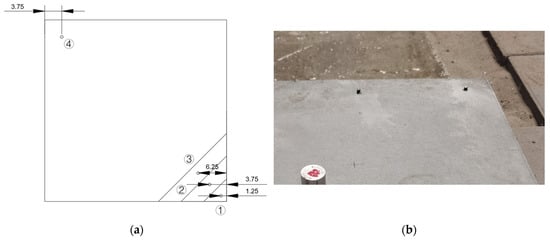 To capture spatial variation in dynamic response, four accelerometers (Sensors #1–#4) were arranged along the diagonal of the pavement slab, numbered sequentially from right to left. Sensors #2 and #4 were positioned symmetrically relative to the slab corners, maintaining equal distances from the edges, to enable comparison of responses at mirrored positions. The artificial void was introduced beneath the region encompassing Sensors #1 through #3, as shown in Figure 3a. Installation was carried out by embedding M5 bolts into pre-drilled holes on the slab surface. These bolts were secured using AB adhesive and allowed to cure for 24 h to ensure mounting stability (Figure 3b). The accelerometers were then affixed to the bolts via threaded connections, completing the measurement array.