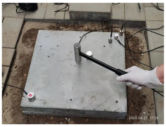 To simulate external excitation, an INV931X IEPE impact hammer was employed to apply transient loads at the center of the slab surface. The initial impact force was controlled at approximately 10 kN, and all strikes were performed by the same operator to ensure consistency (Figure 4). The loading protocol began with a baseline test under the no-void condition, followed by sequential tests corresponding to void sizes of 5 cm, 10 cm, and 15 cm. For each void scenario, the same loading procedure was repeated to obtain consistent vibration responses, resulting in a comprehensive dataset for the evaluation of the effects of void severity on dynamic behavior.