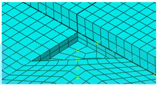 Considering that corner voids typically propagate inward along a diagonal direction, voids were idealized as isosceles right triangles with legs aligned parallel to the slab edges. The leg length served as a quantitative indicator of void extent as shown in Table 3. The voids were modeled as geometric cutouts between the surface and base layers as shown in Figure 6. The light blue grid represents the meshed pavement structure, while the yellow circles denote the selected nodes used for response extraction. Contact within the void region was defined as “free separation” (i.e., frictionless and non-load transferring), simulating interface failure due to delamination.