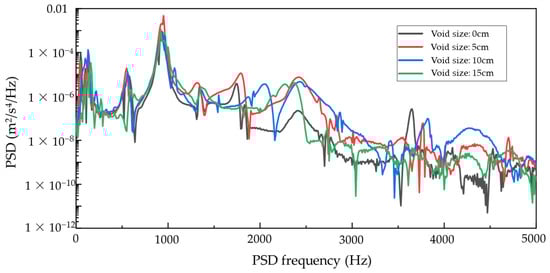 At higher frequencies (above 2000 Hz), the PSD amplitude under the 15 cm void condition exhibits the steepest decline, suggesting considerable energy attenuation. This implies that high-frequency components are particularly susceptible to damping in extensively voided regions, possibly due to the reduced interface stiffness and increased localized damping effects resulting from large-scale delamination.