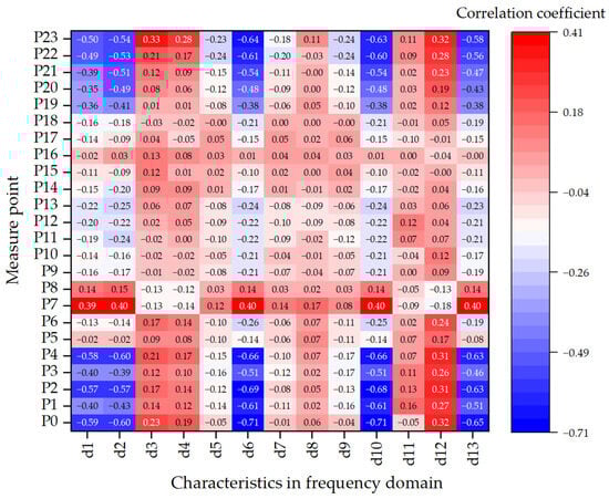 To further assess the impact of voiding on frequency response, 13 spectral features (d1–d13) were extracted and analyzed. Figure 11 presents the Pearson correlation heatmap between these frequency-domain features and void sizes across all sensor locations. Features such as d5 (spectral centroid), d6 (frequency standard deviation), and d10 (normalized bandwidth) exhibit strong negative correlations (|r| > 0.7) at multiple measure points, indicating a downward shift in dominant frequencies and increased spectral dispersion due to stiffness degradation.