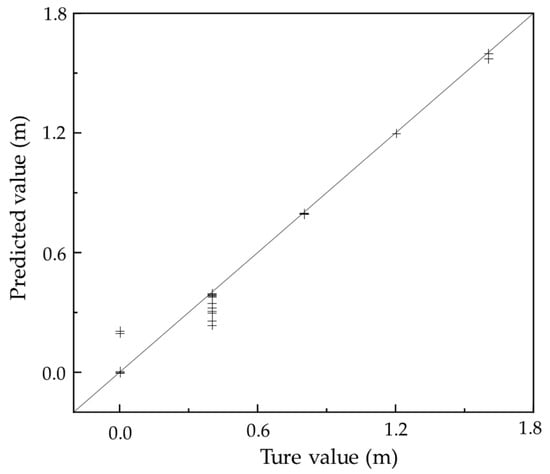 To evaluate the performance of the proposed Random Forest (RF) model in the quantitative estimation of sub-slab void size, three commonly used regression metrics were employed: the coefficient of determination (R2), root mean square error (RMSE), and mean absolute error (MAE). Using the previously constructed feature matrix and optimized hyperparameter settings, the RF model was trained and tested. The model exhibited excellent predictive performance on the test set, achieving R2 = 0.991, RMSE = 0.054 m, and MAE = 0.021 m, indicating that it could explain 99.1% of the variance in the target variable while maintaining prediction errors within approximately 6 cm. This level of accuracy demonstrates the model’s effectiveness in detecting and quantitatively assessing corner voids in pavement structures.