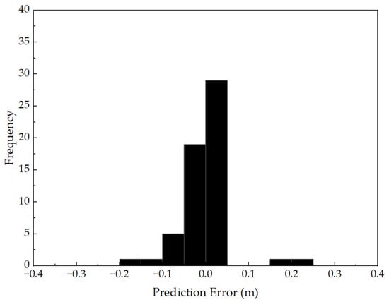 Figure 13 illustrates the probability distribution of prediction errors, offering insight into the statistical characteristics and bias behavior of the residuals. The histogram displays the frequency of error samples across defined intervals, overlaid with a kernel density estimate (KDE) curve to indicate the continuous distribution. The error distribution exhibits a near-zero-centered, symmetric, and unimodal shape, with the majority of residuals falling within the range of [−0.05, +0.05] m. The peak of the distribution is located near zero, confirming the absence of systematic bias or skewness. Additionally, the steep attenuation of the distribution tails suggests a lack of long-tailed or extreme error values, demonstrating the model’s robustness and resistance to outliers, even under limited data conditions.