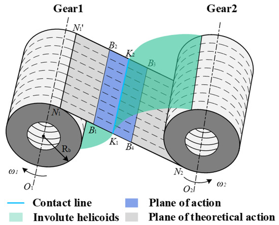 The meshing mode of the planetary gear is mainly divided into external meshing and internal meshing, and the external meshing of the gear is shown in Figure 1. In the figure, O1 and O2 indicate the rotary axis of the driving and driven gear, respectively; ω1 and ω2 indicate the rotational speed; N1N′1N′2N2 indicates the theoretical meshing plane of the two gears, B1B′1B′2B2 is the actual meshing plane, and K1K2 indicates the contact line.