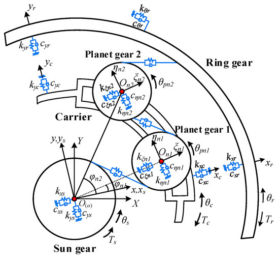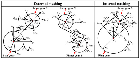 Before transforming the coordinates, it is essential to establish the coordinate systems for the dual-star planetary gear train as illustrated in Figure 3. It includes three coordinate systems: (1) The stationary coordinate system OXY, with its origin located at the theoretical center of the sun gear. (2) The rotating coordinate system oxy, whose coordinate origin coincides with the theoretical center of the sun gear, but synchronously rotates with the planet carrier. (3) The rotating coordinate system oniξniηni (where n denotes the nth planetary gear set and i = 1, 2), which also rotate synchronously with the planet carrier, its coordinate origin is located in the theoretical center of the ith planet gear, with the ξn1 axis aligned along the connection line between the first planet gear and the sun gear. In order to facilitate the establishment of the coordinate system and the subsequent derivation of the dynamic equations, inside and outside of the two planet gears, the direction of the coordinate system is set to the same direction; the relevant parameters can be found in Ref. [2].