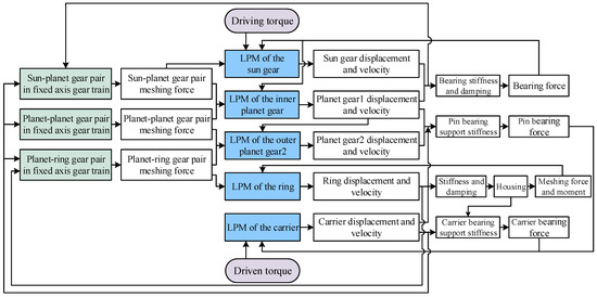 The dynamic modeling procedure for the dual-star planetary gear system is illustrated in Figure 5. The input torque drives the sun gear, and the respective displacements and velocities are obtained from the LPMs of the sun gear and the inner planet gear. Based on these, along with the displacement and velocity of the carrier, the meshing force between the sun gear and the inner planet gear is calculated using the fixed-axis gear train. Additionally, due to the bearing stiffness and damping, a bearing reaction force is generated. Both the meshing forces (sun-planet and inner planet) and the bearing force are then fed back into their respective LPMs for dynamic analysis. From the LPMs of the inner and outer planet gears, their respective displacements and velocities are obtained. Combined with the displacement and velocity of the carrier, the meshing force between the inner and outer planet gears is calculated using the fixed-axis gear train and then fed back into their LPMs. Similarly, the displacement and velocity of the ring gear are derived from its LPM. Along with the displacement and velocity of the carrier, the meshing forces between the outer planet gear and the ring gear are computed via the fixed-axis gear train and fed back into the LPMs of the outer planet gear and the ring gear, respectively. Additionally, since the ring gear is fixed, the housing applies a reaction force and moment to the LPM of the ring gear due to the effects of the stiffness and damping. The bearing force of the pin shaft is generated by the displacements and velocities of the carrier and the inner/outer planet gears acting on it. This force, along with the output load torque, is then fed back into the LPM of the carrier. In summary, the dynamic coupling among all components of the dual-star planetary gear system is established, completing the establishment of the dynamic model.