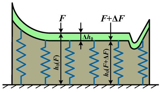 The equivalent model of oil film stiffness is illustrated in Figure 6. The central film thickness and elastic deformation at each meshing position are obtained through a surrogate model and dynamic simulation, respectively. The difference between the center oil film thickness and the elastic deformation represents the rigid body displacement. Under the action force F, the displacement of the rigid body is calculated as h0(F). Subsequent application of force increment ΔF, the displacement of the rigid body is h0(F + ΔF).