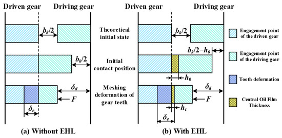 In the deformation region xin < x < xout, the pressure distribution and the elastic deformation of the gear tooth are considered. According to the elastic half-space theory, the elastic deformation δ(x, t) of two contacting bodies under normal pressure can be expressed as follows [8,9]: