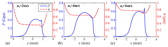 Distribution diagram of oil pressure (P) and film thickness (h) at different speeds. (a) Relative sliding velocity us = 2 m/s, (b) Relative sliding velocity us = 4 m/s, (c) Relative sliding velocity us = 6 m/s.
