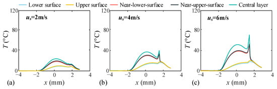 Temperature rise distribution of each layer of oil film at different speeds. (a) Relative sliding velocity us = 2 m/s, (b) Relative sliding velocity us = 4 m/s, (c) Relative sliding velocity us = 6 m/s.
